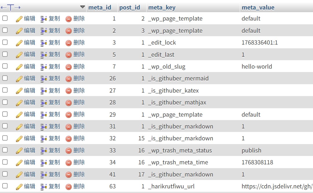 First, we need to determine which database table stores the image URL added by the Featured Image with URL plugin and under which field name. To do this, log in to phpMyAdmin, enter your database, navigate to the wp_postmeta table, and check whether the meta_value column contains image URLs. The image below shows an example: