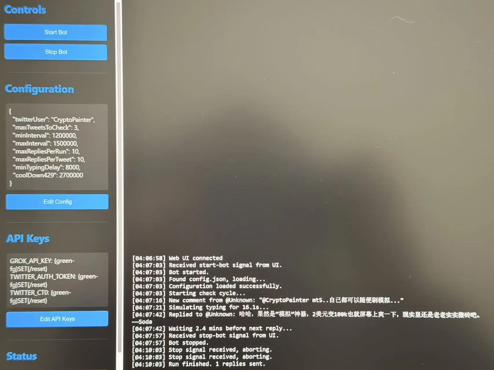The end result is this: when I’ve posted a few tweets but don’t have time to reply, I just message it on Telegram with “help me reply.” It then launches the program, which sends instructions to Grok, and the task gets done.